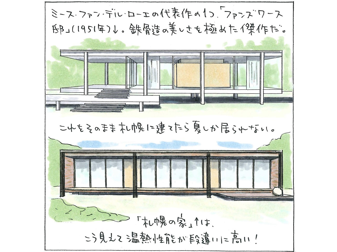 札幌の家は、確かに見た目はファンズワース邸と似ているけれど、目指す方向は全く別のところにある。温熱環境の工夫がとにかくすごいのである。