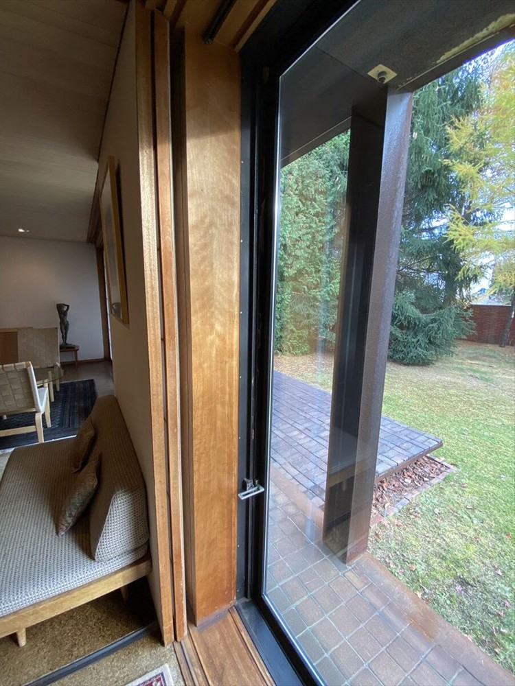 理由は室内に入ればわかる。床から天井までの大きな窓から庭の緑が見え、柔らかな光が入る。鉄骨で梁を架けることで、南側に大開口をつくりたかったのだ。強固な鉄骨による柱・梁なので、屋根を無落雪屋根(雪が滑り落ちない屋根)にして水平性を強調することもできる。ここまでは、ミースに近い考え方だ。
