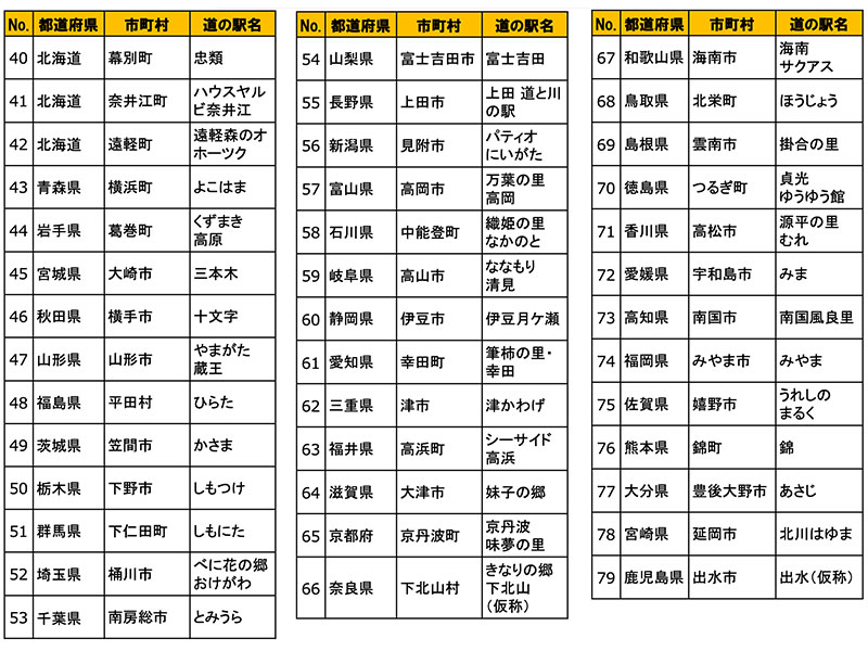 今回追加された40駅は、北海道から九州まで全国各地に広がる。例えば、北海道の「忠類」「ハウスヤルビ奈井江」、東北の「三本木」「やまがた蔵王」、関東の「かさま」「しもつけ」、中部の「伊豆月ケ瀬」「筆柿の里・幸田」、近畿の「シーサイド高浜」「妹子の郷」、中国・四国の「掛合の里」「源平の里むれ」、九州の「みやま」「錦」「北川はゆま」など、各地の交通・物流の要所が選ばれている。