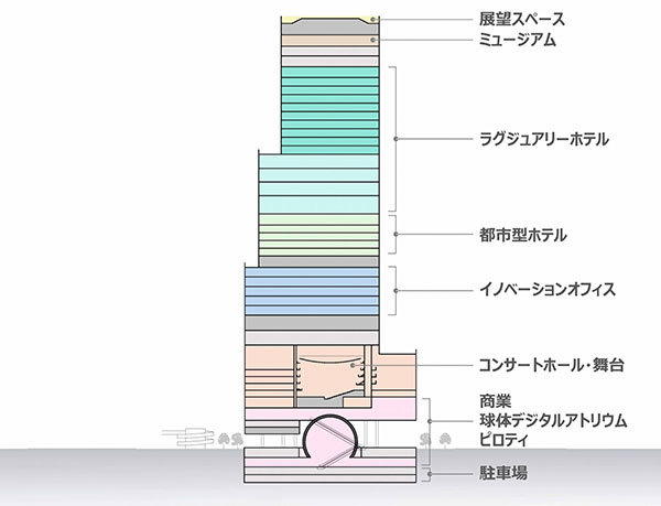施設構成は上層階から順に、展望スペース、ミュージアム、ホテル、イノベーションオフィス、コンサートホール・舞台、商業施設、駐車場などが計画されている。