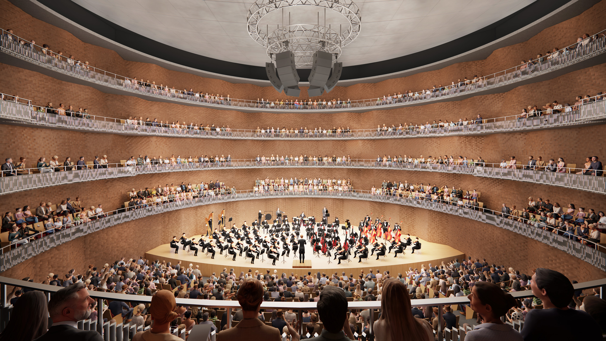 「このコンサートホール・舞台は、最も遠い席でもステージまでの距離が20メートル以内に収まるよう設計されています。そうすることで、観客とステージの距離が近い、親密性があふれるホールになるでしょう」と話す。