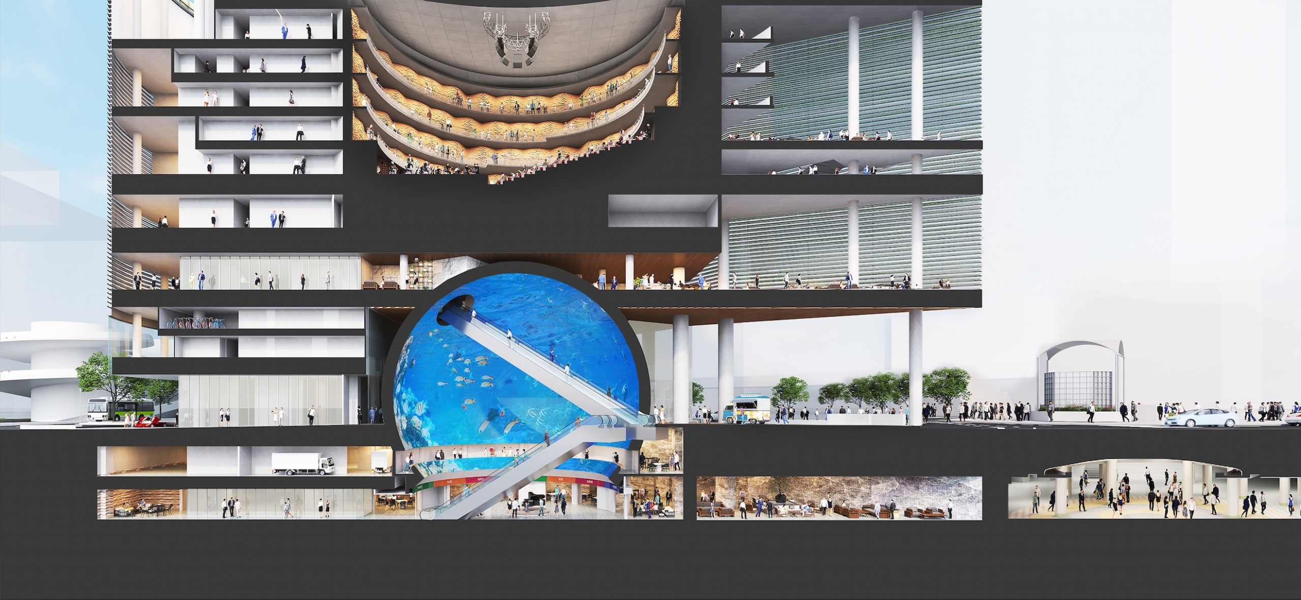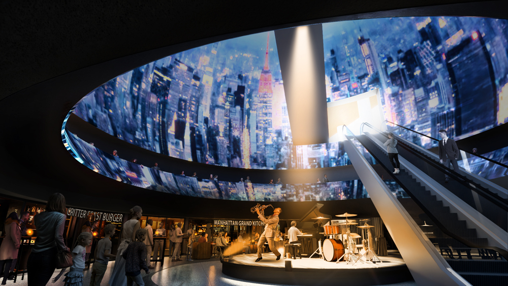 また、球体アトリウムを囲むように円形のカフェなど、映像を楽しみながら飲食できる空間も検討中である。
