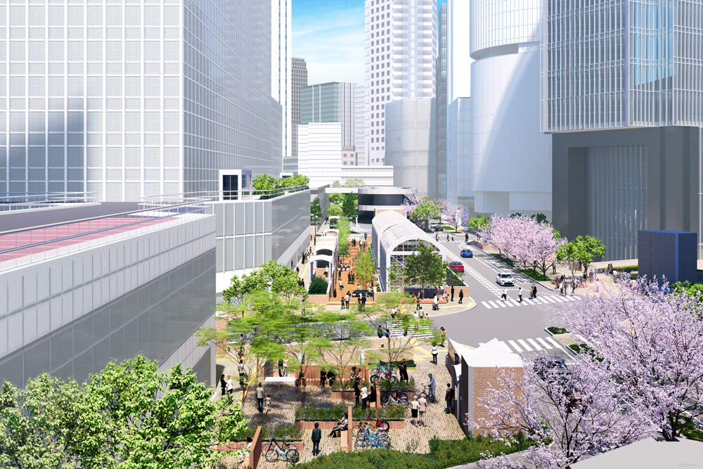 これまで車中心だった梅田の地上部分を大阪マルビルの周辺で人中心の空間へ。