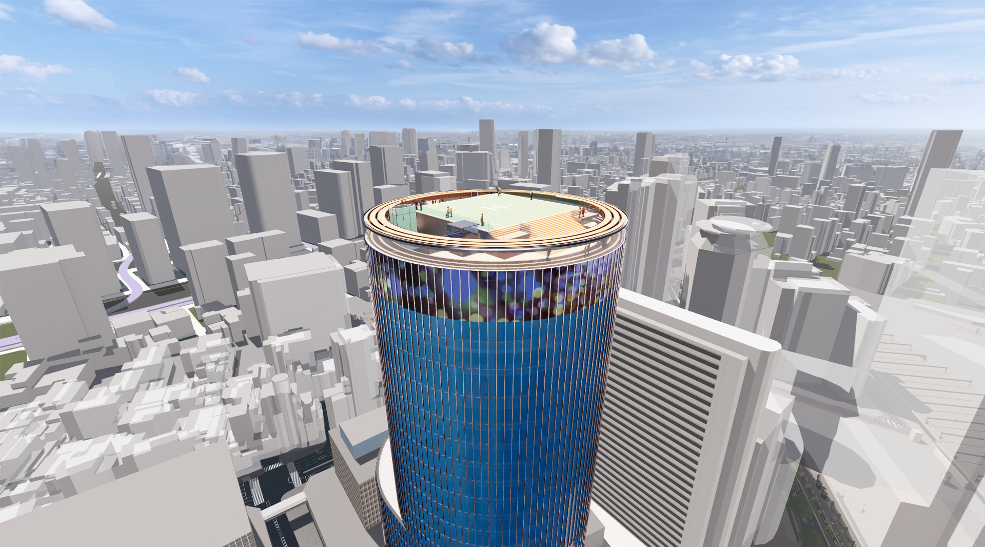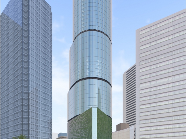 “都市再生のシンボルツリー”のコンセプトに従って大樹のような円筒形状はガラスカーテンウォールで構成され、低層部の外装には大樹の枝葉をイメージした緑化ルーバーが計画されている。地上部分には大樹の木陰を感じられるような、半屋外の屋根下空間である「ピロティ」が設けられ、都市と自然の調和を目指した設計となっている。