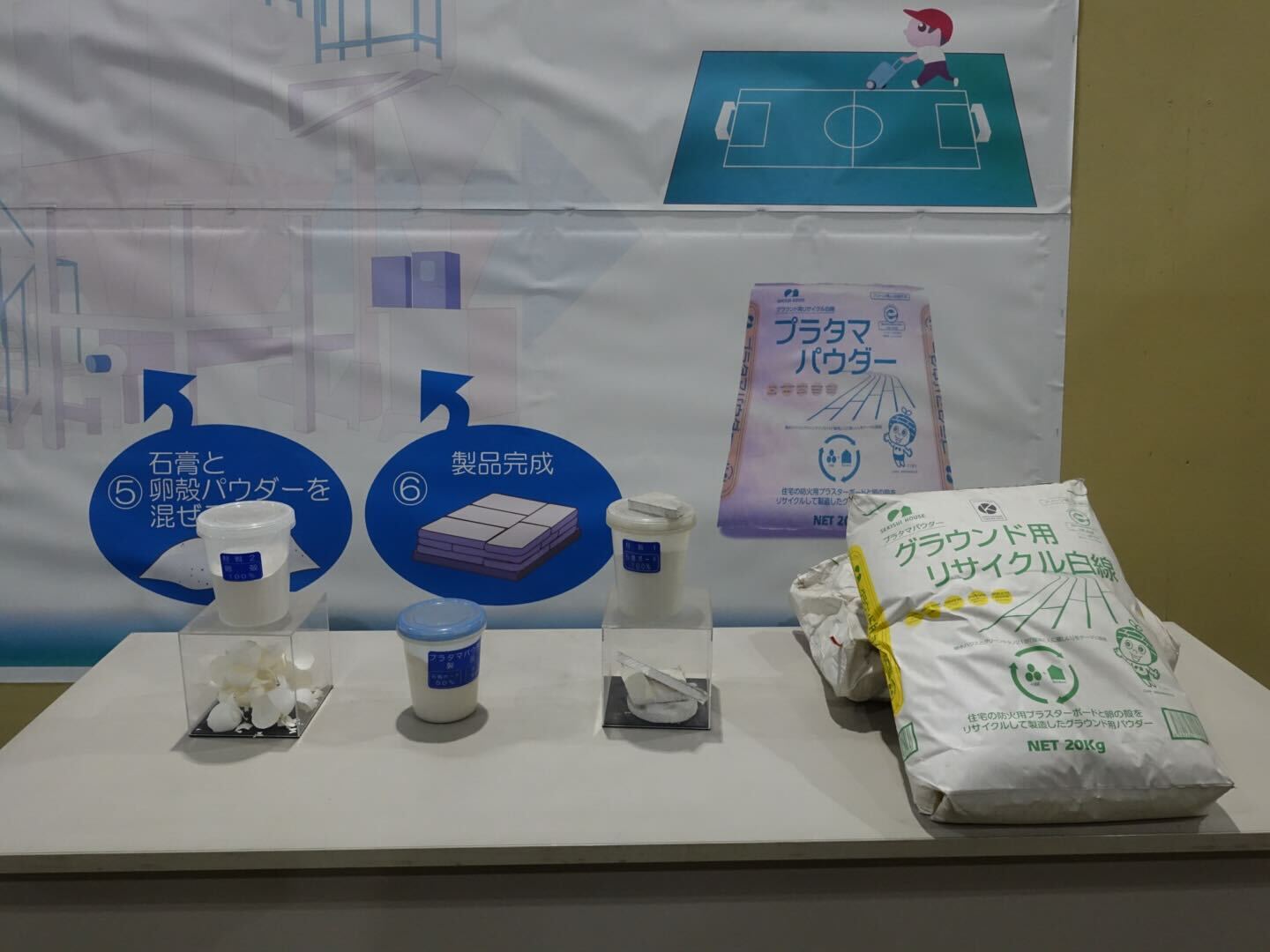 石こうボードの端材は卵殻と混ぜて、グラウンド用のライン材「プラタマパウダー」として再生する。近隣の小学校などでよく使われているという。