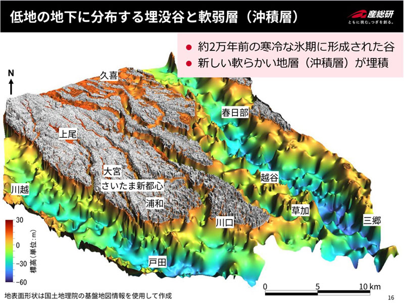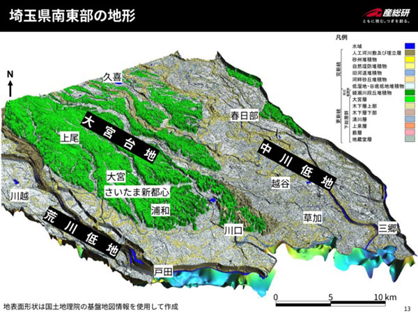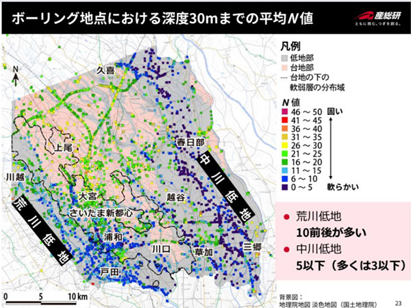 今回対象となったエリアは大宮台地を中心に南西に川口市、戸田市などが立地する荒川低地、東に春日部市、越谷市、三郷市、草加市などが立地する中川低地が広がる地域なのだが、ふたつの低地には沖積層と呼ばれる軟弱な地層が分布している。