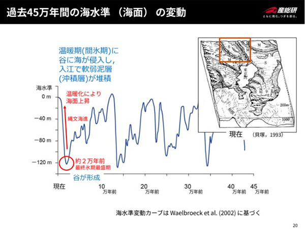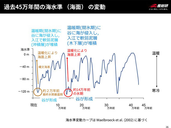 この軟弱層が堆積したのは約2万年以降。地球では過去40万年の間に4回の大きな氷期があり、氷期の間、海面は今よりもはるかに低いところにあった。一番最近の氷期は約2万年前が最盛期だったとされており、その後、温暖期が訪れて海面が上昇。氷期に作られた谷に海が入り込み、そこで軟弱泥層(沖積層)が堆積した。つまり、今、私たちが見ている、見て分かる低地の地下には約2万年前に作られた谷があり、そこを軟らかい堆積物が埋めているというわけだ。