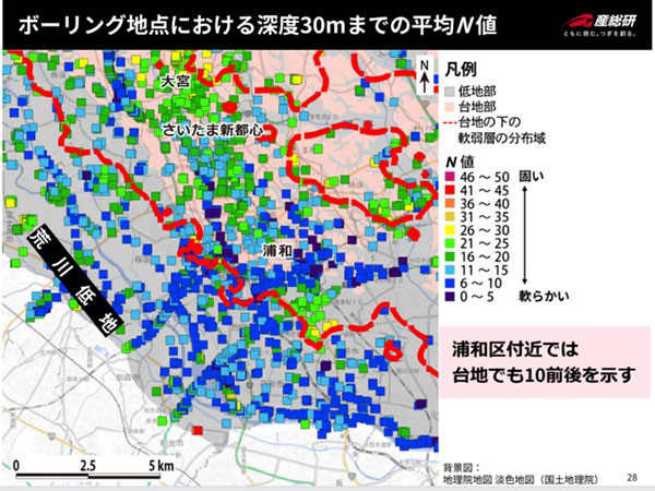 大宮台地では荒川の下流側にあたる大宮、浦和が軟らかく、台地の地下に軟弱層が厚く分布するさいたま市浦和区付近では、台地でありながら深度30mまでの平均N値が10前後と、荒川低地とあまり変わらない値を示すことがあきらかになりました」