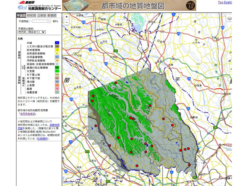 では、低地、台地それぞれの地下の谷はどこにどのように広がっているかを3次元地質地盤図で見ていこう。画面の左上部に平面図、柱状図、立体図、断面図という表記があるので谷の深さを見る場合には平面図を選択する。