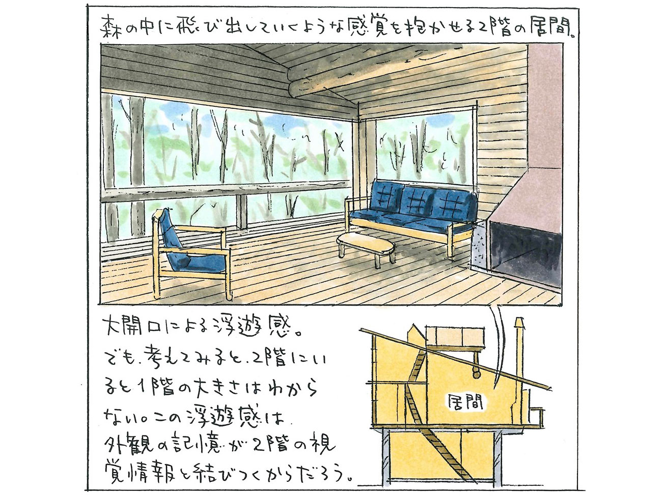 この居間で感じる浮遊感は、家に上がる前に「2階がせり出している」という記憶が刻まれ、それと内部の印象が結びつくことで生まれるのだ。モノではなく、人間の心理を設計しているともいえる。