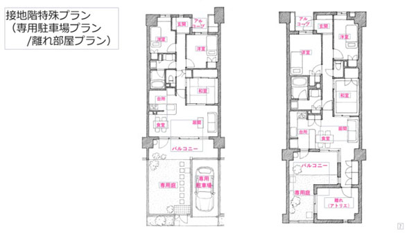 接地階、つまり1階だけに個性的なプランがある物件もある。一般に1階はあまり人気がないため、それをカバーしようと広くしたり、特別な間取りにしたりという工夫をしている物件があるのだ。