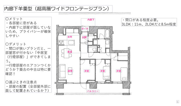 逆に間口の狭いプランを選ぶ際には住戸中央の居室が行燈部屋(あんどんべや:暗いため、照明が必要なことからのネーミング)になってしまいがち。築年数の古い物件では暗いだけでなく、エアコンが設置できないこともある。リビングとつなげて使い、エアコンもリビングのものをというのであればよいが、そうでないと昨今の気候では使えない部屋が生まれてしまう。