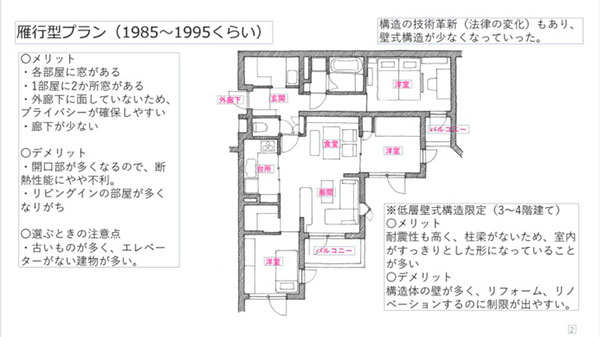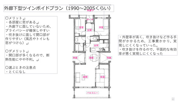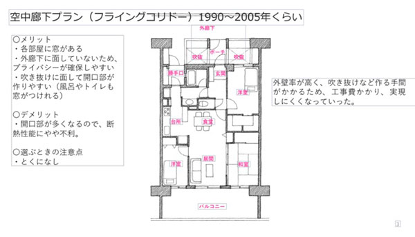 だが、これも空中プラン同様に外壁率が高く、吹き抜けなどを作る手間がかかるため、工事費が高くなり、作られなくなってきている。