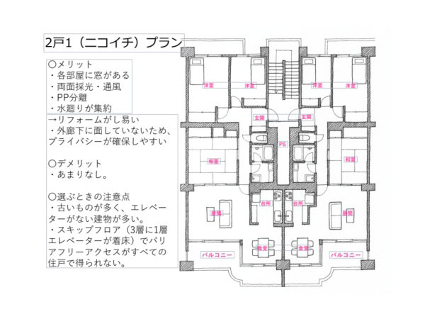 この間取りは各部屋に窓があり、外廊下に面していないため、プライバシーが確保しやすいのがメリット。住戸、階段やエレベーターの位置によっては窓を開けていても人目が気にならないこともある。