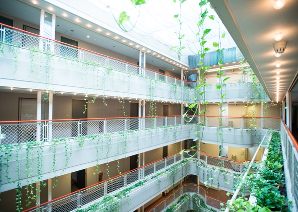 外廊下と住戸の間に吹き抜けのある空中廊下プラン