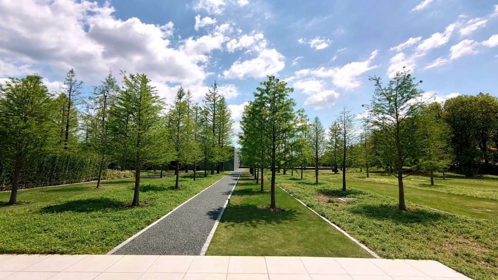 駐車場からのアプローチを進むと、高木がリズミカルに並ぶ庭が広がり、その奥に「豊田市博物館」が見えてきた。頭上にぽっかりと広がる空と、別天地のような静けさが印象的だ。