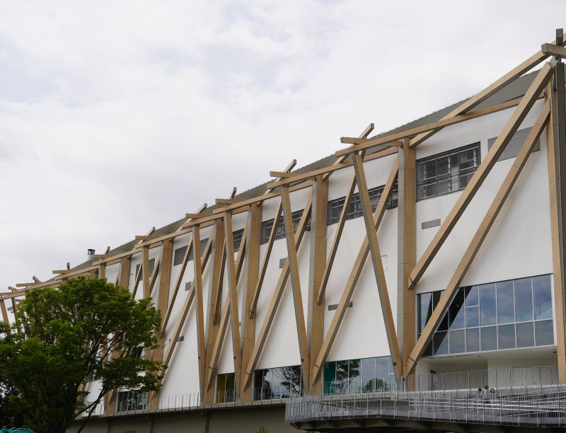 当サイトで建設が始まった2022年に、その時点で発表されていた概要をまとめた記事をアップした(愛知県新体育館が2025年夏にオープン予定。国際的施設として愛知・名古屋の新しいシンボルに)。そこで紹介したパースで特徴的だったのが、外壁に木材があしらわれていること。建設途中に通りがかったときにも見たことがあったが、完成してあらためて見ると白い外壁に木材がせり出すように組まれたデザインが映える。