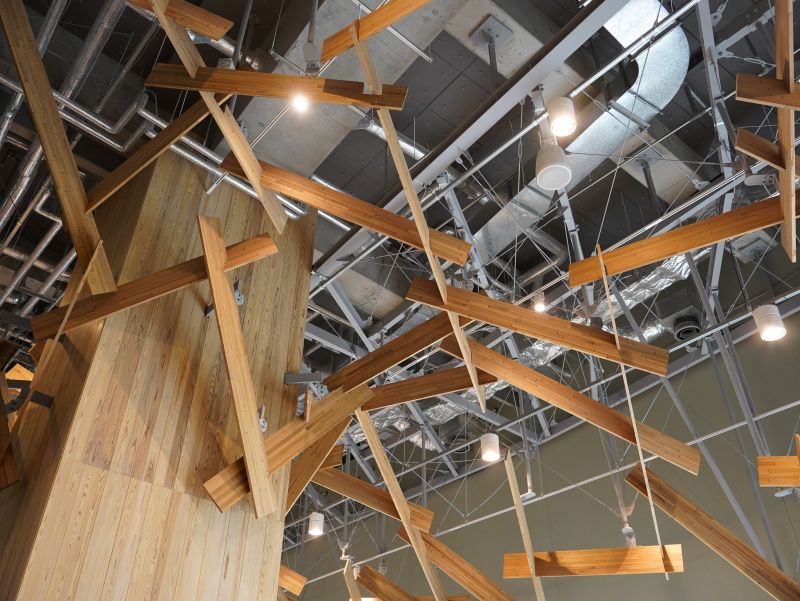 配管などがむき出しになった天井に木材が幾何学的に配置されていた。すべての柱ではなかったが、木材で覆われた柱とつながって、木の幹と枝のように感じられた。このデザインは「木陰天井」と名付けられ、ガラス窓から見える公園の木々と連続性を生む。