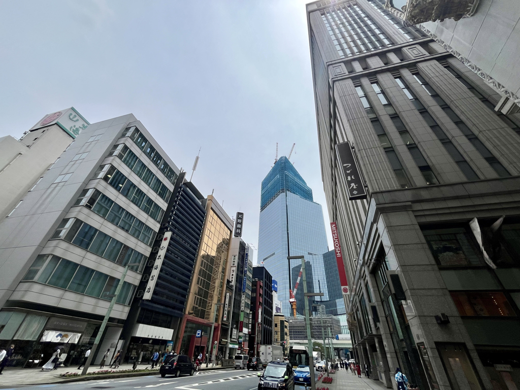 続いて2018年3月に都市計画決定されたのが、「日本橋一丁目中地区」だ。こちらでも建築工事が進行中で、東京メトロ三越前駅から地上に出ると、眼前に建設中の高層ビルがそびえている。建物は地上52階建て・高さ約285mの超高層となる予定だ。また、関連する市街地再開発事業の中では最も早い2026年3月に竣工が予定されている。
