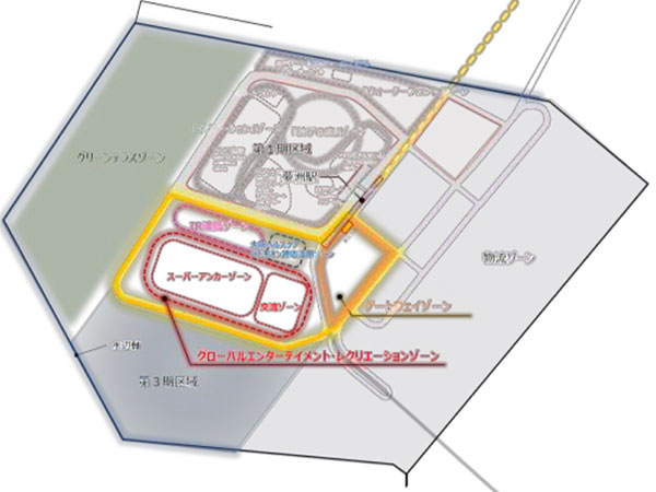 中央部の「グローバルエンターテイメント・レクリエーションゾーン」は、西側の「スーパーアンカーゾーン」と東側の「交流ゾーン」の2つに分かれている。スーパーアンカーゾーンでは、ここでしか体験できない「非日常空間」を創出するエンターテイメント機能やレクリエーション機能の導入、ファミリーで楽しめる機能の導入などが計画されている。交流ゾーンでは、ゲートウェイゾーンからの人の流れをスーパーアンカーゾーンへつなげるハブ拠点を形成する。