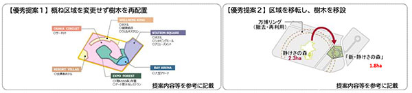 静けさの森の継承では、両提案とも中央緑地の樹木を活用した新たな緑地空間の創出を盛り込んでいる。大林組案では静けさの森を拡張してアート展示スペースを整備し、関電不動産開発案では樹木を移設した新公園の設置を計画している。