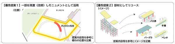 大屋根リングの活用方法として、2つの優秀提案でそれぞれ異なる方法が示された。株式会社大林組大阪本店は一部をモニュメントとして残置改修し、万博のシンボル性を直接継承することを提案した。一方、関電不動産開発株式会社は解体した木材部材をベンチやパーゴラなどの街路設備にリユースし、来訪者が日常的に触れられる形での継承を提案している。