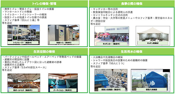 事例集では、体制整備やトイレ環境の整備、食事の確保や寝床・プライバシー確保など11のテーマで29の先進事例を紹介している。具体的には、愛媛県の避難所運営マニュアルの策定啓発や、宮崎県都城市のQRコードを活用した避難者情報管理、兵庫県南あわじ市・愛媛県宇和島市・長崎県島原市のトイレカー共同運用協定の締結、熊本県益城町の飲食店組合との炊き出し体制確保などが掲載されている。