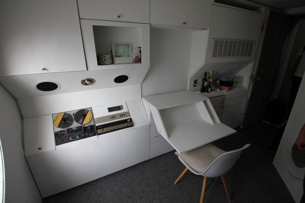 それぞれが無駄なくすっきりと配置され、そのほとんどが同じ位置で手にできてしまう。机は収納式で、コクピットを思わせる壁にピタリと収まる。オーディオ装置や電卓は旧式であるものの、その存在自体が美しい。筆者は入った瞬間に「うわ、このカプセル欲しい!」と思った。