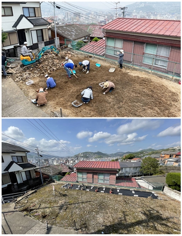 中新町エリアは長崎の重要伝統的建造物保存地区である東山手エリアに隣接する住宅地で、細い路地、階段の周囲に小規模な住宅が密集する典型的な長崎の斜面地。中心地のひとつ、新地中華街あたりからなら15分くらいだろうか、十分歩ける距離だが、資産性はあまり高くはなく、空き家も2~3割くらいに及ぶ。歩いているとところどころに朽ち始めた住宅を見かけるエリアだ。その中にぽつんぽつんと更地になった土地があり、平山さんが自治会に替わって管理を始めたのはそんな土地のひとつ。