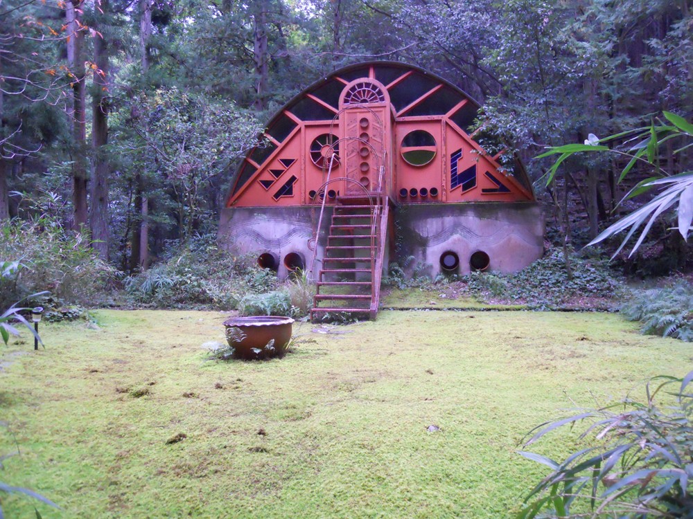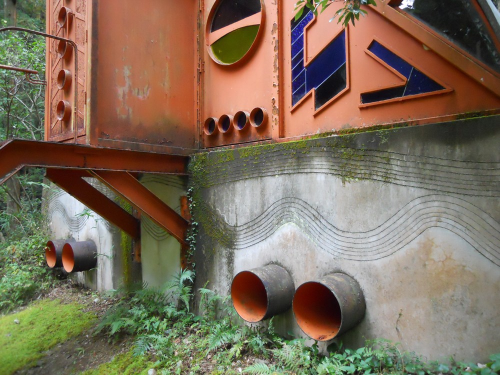 長辺方向は川合の自邸と同じようにコルゲートの板をクルッとまるめた「構造=形」のデザインだ。だが、妻面は合理性からはほど遠い。おにぎり形の妻面は下部の3分の1ほどがコンクリート。表面には波の模様が描かれている、その上は、さび止めのオレンジ色に塗られた富士山型の壁。その上はガラス。