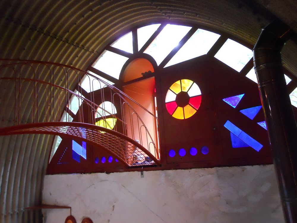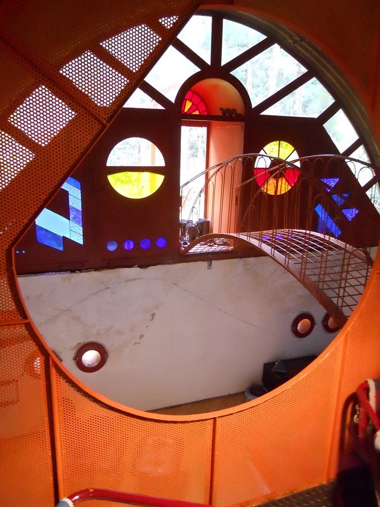 富士山の中央にある入り口は縦長のアーチで、その左右には色ガラスがはめられた2つの丸窓。一方は上下が鉄の部材で分けられ、ウインクしているように見える。2つの丸窓の下には色ガラスをはめた丸や三角の小さな開口部がちらばる。形も色も強烈だ。