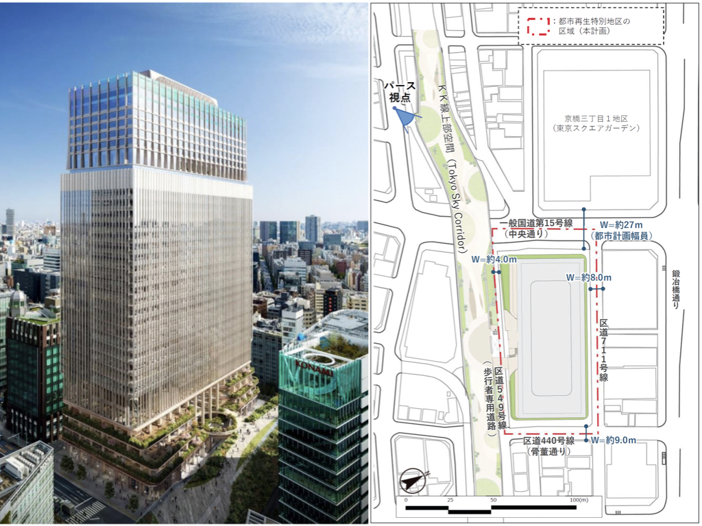 「京橋」と「銀座」の結節部として、放射第28号線(中央通り:国道15号)の賑わいの連続性を創出する拠点、地下・地上・KK線上部空間(Tokyo Sky Corridor)をつなぐ歩行者ネットワークの整備による回遊性の高い国際都市東京の玄関口の形成に寄与。
