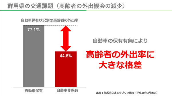 「車を所有している高齢者、していない高齢者では外出率がそれぞれ8割弱、4割強となっており、大きな差になっています。一方で高齢者の運転には危険を伴うことがありますし、免許返納には足回りが不便になるという声も。そのあたりを公共交通で補うことで高齢者にも、社会にも良いやり方があり得るかもしれません」と関口さん。