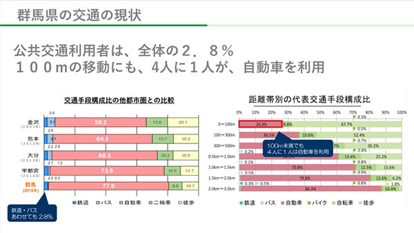 「群馬県は利根川を中心にした県東南部に関東平野からの平野が広がり、それ以外の県内3分の2ほどは山地や丘陵です。平野には前橋市や高崎市など中規模の都市が低密度に広がっており、それ以外の地域も同様。交通網の利便性向上は、県としても課題でした。県内ではバスの通行が1時間に1本未満の地域が県土の43%を占めており、鉄道を利用しても、駅でバスを30分以上待たなくてはいけないのであればやはり自動車が便利となってしまいます。