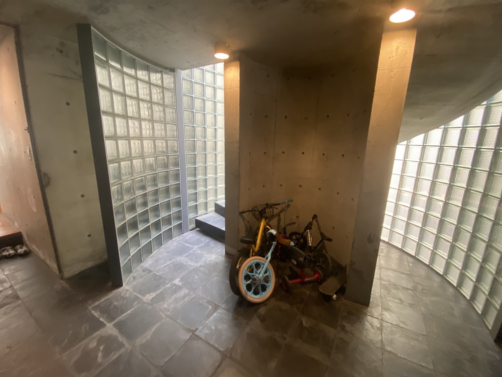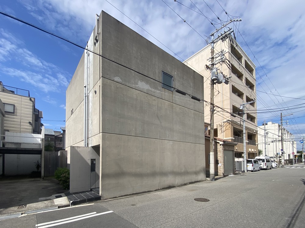 「ガラスブロックの家」という名前から、外観がガラスブロックでぐるっと覆われた家を想像していた人は、「えっ」と思う。外観には1枚のガラスブロックもない。それどころか、窓もほとんどない。地上3階建ての建物の四周がコンクリート打ち放しの壁でがっつり囲まれている。なんとも無機的な外観だ。