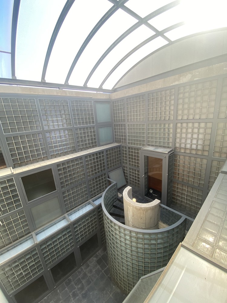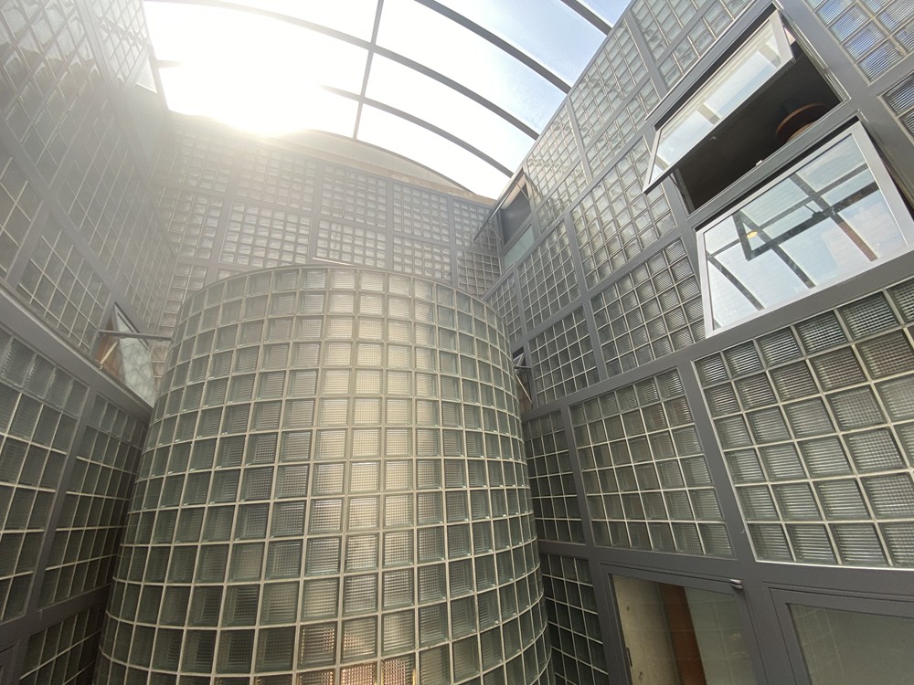 建物に入り、らせん階段を上って振り返ると、初めてガラスブロックに囲まれた中庭(光庭)を目にすることができる。ようやく、「おおっ」と声が出る。3面がガラスブロックの壁。しかも、南北面はひな壇のようにセットバックしていく。