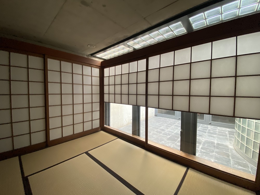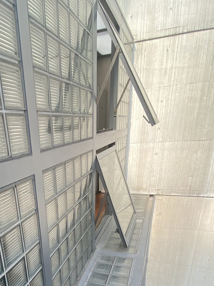 この家を写真で見ていた筆者の印象は、「風通しが悪くて湿っぽそうな家」だった。行ってみると、ガラスブロック部分は開閉しないものの、正方形の大きな窓がたくさんあって、これは開け閉めできることがわかった。囲まれた光庭に面した窓だから、人目を気にせずに開け放つことができる。