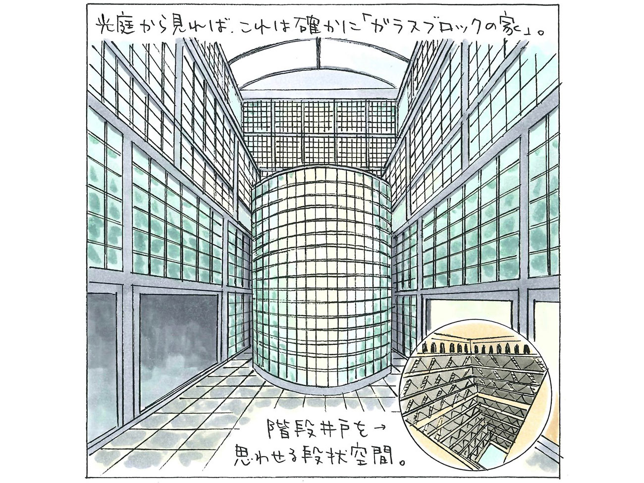 安藤氏は、1965年の欧州の旅の終盤に、インドで階段井戸を実際に見ている。80年代以降に手がける地下型の建築について自身でも階段井戸の影響を語っているが、その出発点はこのガラスブロックの家とみていいだろう。