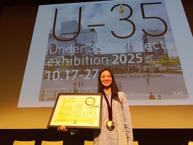 U-35はこれからの活躍が期待される 35歳以下の出展候補者を全国から募り、今年は万博の大屋根リングでも知られるひと世代上の建築家 藤本壮介の厳正な審査を経て選出された7作品の展覧会である。また、その出展作品の中から優秀な作品を選出し、Under 35 Architects exhibition 2025 Gold Medal賞と歴代のGoldMedal受賞者の中から新設されたSilver Medal賞が授与される。まさに、若手建築家の登竜門としての展覧会だ。