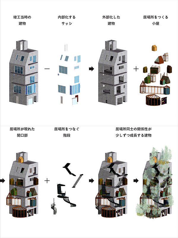 自分の分身のような建築に挑戦。「人間的な家」とは、人間と家、暮らしの要素が不可分に渾然一体となり、「建築という器からあふれ出してくる状態」をイメージしている。昨年、RC造の実家の一部にあるバーを「建物の内部にある外部」として捉え、開口部に自律した居場所をつくる「小屋のような建具」を設計した。家の未来像として、開口部に居場所をつくる可能性を建物全体に展開し、内側に外部空間を残して「建具のような小屋」を差し込んでいくことを提案。暮らしの変化に応じて小屋が動的な居場所をつくり、潜在的な個性が建築から少しずつあふれ出すことをめざした。