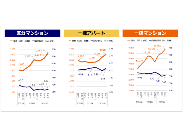 不動産価格の高騰が続いている。健美家株式会社の「収益不動産市場動向四半期レポート2025年7月〜9月期」によると、建美家に登録された「区分マンション」「一棟アパート」「一棟マンション」の全種別で価格が上昇。前期との比較だと特に区分マンションの上昇率が大きく、+8.31%となっている。