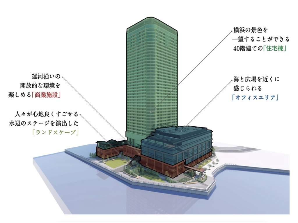 計画されている建築物は、住宅棟、オフィスエリアおよび商業施設から構成される。このうち、住宅棟が40階建て総戸数704戸、オフィスエリアは2〜6階(基準階面積約2,446m2)、商業施設は1〜2階(約4,300m2規模の飲食店舗、サービス店舗)で構成される地下1階・地上40階建て、高さ約150mとなる。