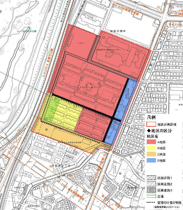 具体的には、エリア内に3つの区画道路と約3,000m2の広場を整備し、歩行者の安全性と利便性を高めるとともに、地域住民の憩いの場を創出する計画だ。この計画では、エリアをA〜Dの4地区に区分し、それぞれに建築物の用途制限を設けている。