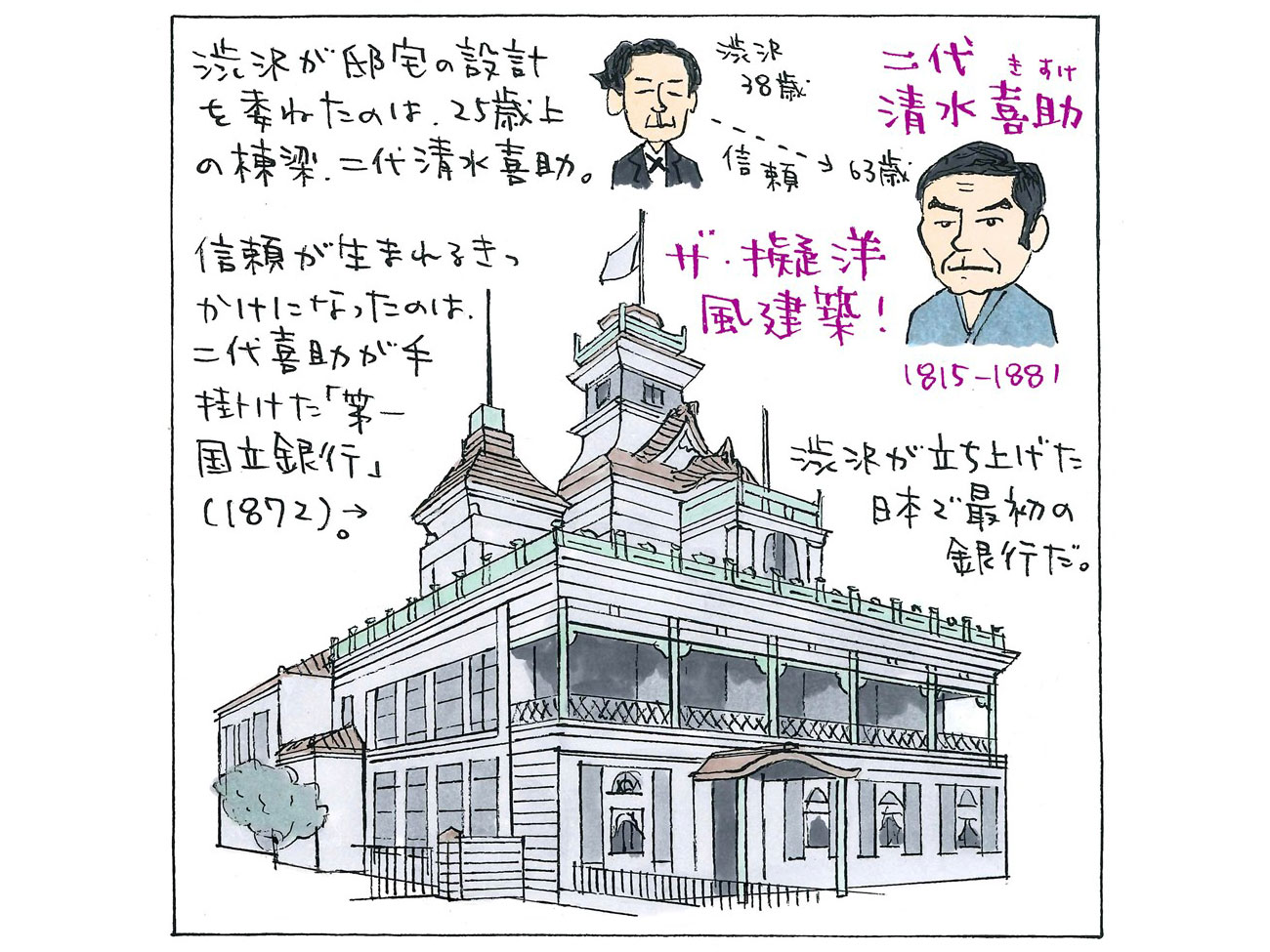 二代喜助は渋沢よりも25歳上。2人の間に信頼関係が生まれたきっかけは、二代喜助が1872年に完成させた第一国立銀行だった。渋沢が初代総監役と頭取を務めた日本最初の銀行だ。東京・兜町につくられたこの建物は、もともとは三井組の銀行として計画されたが、国立銀行条例の施行によって第一国立銀行に譲渡された。