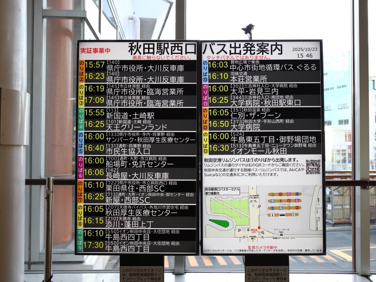 公共交通をより使いやすくするために、バス事業者と連携して、出発時刻や行き先などを表示するデジタルサイネージの設置、バスの接近情報や遅延状況などをスマホで確認できるサービスの開始など、利用者ファーストの取り組みにも注力。また、秋田市では毎月第4金曜日をエコ交通の日と定め、公共交通利用促進を呼びかけている。
