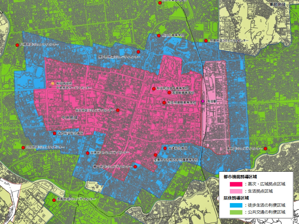 国の施策を受け、秋田市では2018年(平成30年)3月30日に「秋田市立地適正化計画」を策定。秋田市は、都心・中心市街地と6つの地域中心を核とした「多核集約型のコンパクトシティ」形成を目指している。これは、生活に必要なサービス機能を誘導し、それぞれの地域住民が地域内で容易にサービスを受けられるようにするためのものだ。具体的には、医療、福祉、商業、子育て支援施設などについて、居住区域と連携して誘導を図ることとしている。