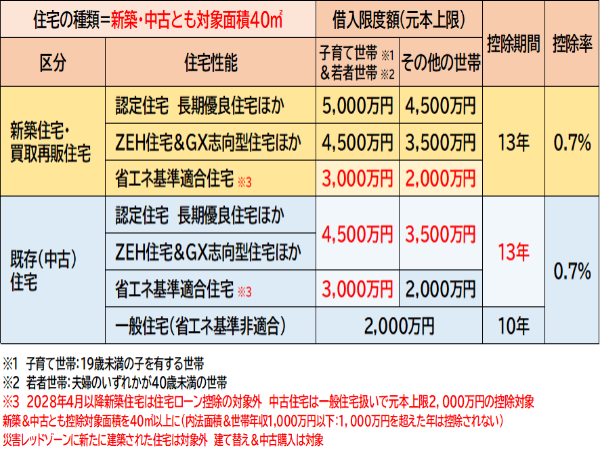 新築住宅は、住宅性能に応じた元本上限と子育て世帯&若者世帯に対する元本上限の上乗せ措置が継続し、13年の控除期間および長期優良住宅など認定住宅は4,500万円(子育て&若者世帯5,000万円)、ZEH住宅は3,500万円(同4,500万円)に設定された元本上限額も2025年度までと同様に設定された。ただし、省エネ基準適合住宅のみ元本上限額が3,000万円から2,000万円(同4,000万円から3,000万円)へと引き下げられている。