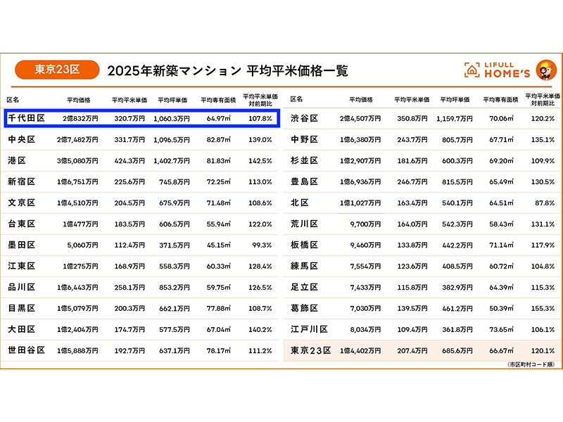 近年、都心における新築マンションの価格は高騰を続けている。LIFULL HOME’Sの調査では、2025年1~5月の東京23区の新築マンションの平均価格は1億4,402万円、平均平米単価は207.4万円(前期比120.1%)を記録した。その中でも千代田区は、23区中4位の平均価格2億832万円、平均平米単価320.7万円(前期比107.8%)となっている。