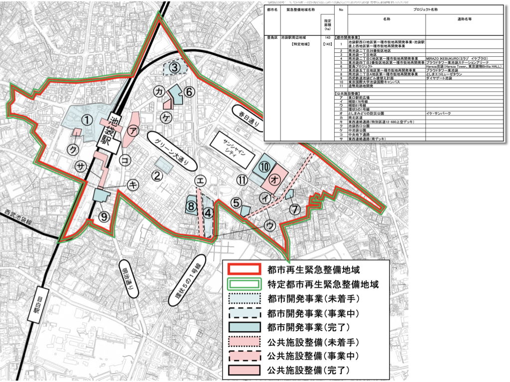 池袋駅周辺において市街地再開発が積極的に進められるようになった背景には、2015年7月、国から指定を受けた「特定都市再生緊急整備地域(根拠法:都市再生特別措置法)」の存在がある。ただし、池袋駅東口においては、この特定地域の指定以前からも、1978年に竣工したサンシャイン60ビルをはじめ、その周辺では市街地再開発は進められてきたが、より積極的な姿勢に転換したのは同地域の指定によるところが大きいといえる。