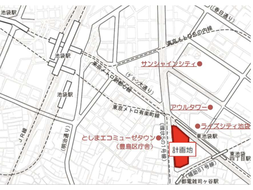 計画地は、池袋駅から東南に約750mのエリアに位置し、東京メトロ有楽町線東池袋駅に隣接している。また、東京メトロ副都心線雑司が谷駅および都電荒川線都電雑司ヶ谷停留場にも近接している。JR線や東武鉄道をはじめとした多数の路線が乗り入れる池袋駅から徒歩圏内であることや、東池袋駅に直結する計画であることから、交通利便性が極めて高いエリアでの事業となる。